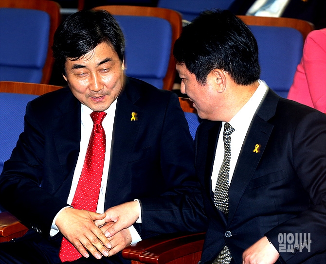 7일, 서울 여의도 국회 본청에서 열린 새정치민주연합 원내대표 선출을 위한 의원총회 도중 최재성·이종걸 두 후보가 이야기를 나누고 있다.