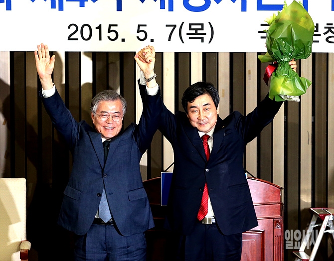 7일, 서울 여의도 국회 본청에서 열린 새정치민주연합 원내대표 선출을 위한 의원총회에서 문재인 대표가 이종걸 당선자와 꽃다발을 들고 환호에 답례하고 있다.