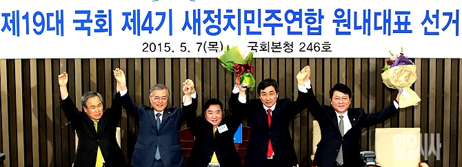 7일 서울 여의도 국회 본청에서 열린 새정치민주연합 원내대표 선출을 위한 의원총회 직후, 문재인 대표·우윤근 전 원내대표, 이종걸 신임 원내대표, 이석현 선거관리위원장 등이 꽃다발을 들고 기뻐하고 있다.