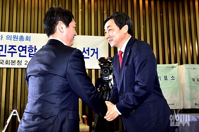 7일, 서울 여의도 국회 본청에서 열린 새정치민주연합 원내대표 경선 직후, 후보로 나섰던 최재성 의원이 이종걸 신임 원내대표와 축하의 악수를 나누고 있다.