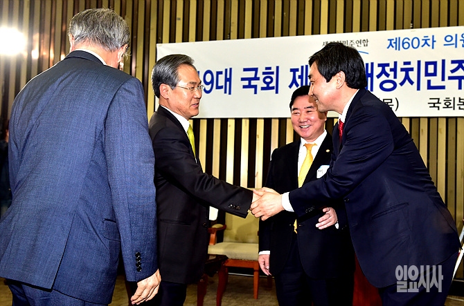 7일, 서울 여의도 국회 본청에서 열린 새정치민주연합 원내대표 경선 직후, 우윤근 전 원내대표와 이종걸 신임 원내대표가 악수를 나누고 있다.