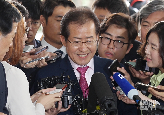 성완종리스트에 이름이 오른 홍준표 경남지사가 8일 오전 서초동 서울고등검찰청에 피의자 신분으로 출석해 취재진의 질문을 듣고 있다.
