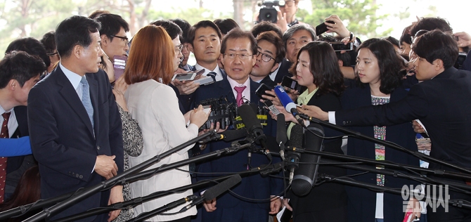 성완종리스트에 이름이 오른 홍준표 경남지사가 피의자 신분으로 조사를 받기 위해 8일 오전 서초동 서울고등검찰청에 출석, 취재진의 질문에 답하고 있다.