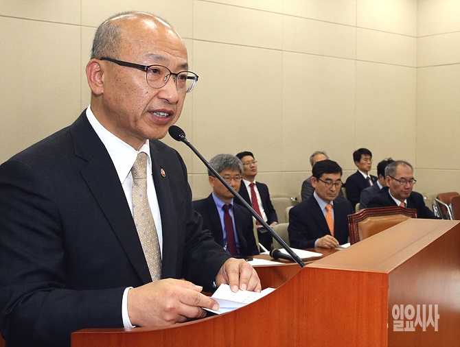 11일, 서울 여의도 국회 보건복지위원회 회의실에서 열린 보건복지위 전체회의 직전, 문형표 보건복지부장관이 의원들에게 업무보고를 하고 있다.