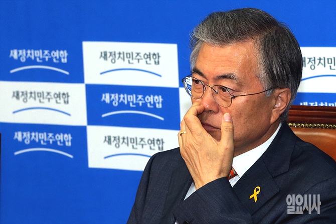 새정치민주연합 문재인 대표가 11일 오후, 북한의 잠수함 발사 탄도미사일(SLBM) 발사 시험과 관련해 서울 여의도 국회 새정치민주연합 당 대표회의실에서 한민구 국방부장관으로부터 군의 대응태세에 대해 보고받으면서 심각한 표정을 짓고 있다.