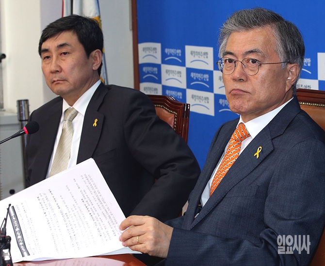 새정치민주연합 문재인 대표와 이종걸 원내대표가 11일 오후, 북한의 잠수함 발사 탄도미사일(SLBM) 발사 시험과 관련해 서울 여의도 국회 새정치민주연합 당 대표회의실에서 한민구 국방부장관으로부터 군의 대응태세에 대해 보고 받으면서 심각한 표정을 짓고 있다.