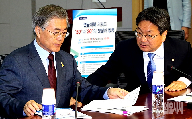 12일, 서울 여의도 국회 의원회관 제1세미나실에 '현금개혁 키워드 '50'과 '20'의 쟁점과 방향 긴급 토론회가 열린 가운데, 문재인 새정치민주연합 대표와 강기정 정책위의장이 참석해 있다.