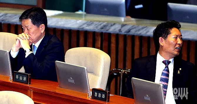 12일 서울 여의도 국회에서 열린 본회의에 참석한 주승용-정청래 새정치민주연합 최고위원이 묘한 표정을 짓고 있다.