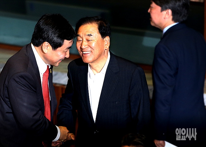 12일 서울 여의도 국회 본회의 직전, 새누리당 이재오 의원과 새정치민주연합 이종걸 의원이 반가운 듯 악수를 나누고 있다.