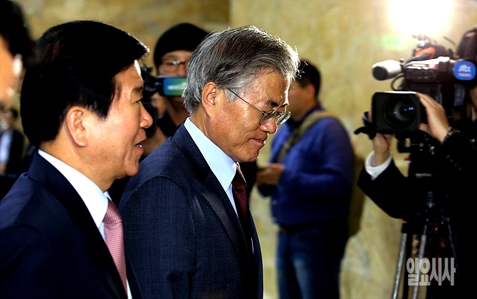 12일 서울 여의도 국회 본회의장에서 예정된 본회의 참석을 위해 문재인 대표와 이병석 의원(국회 부의장)이 본회의장을 향하고 있다.