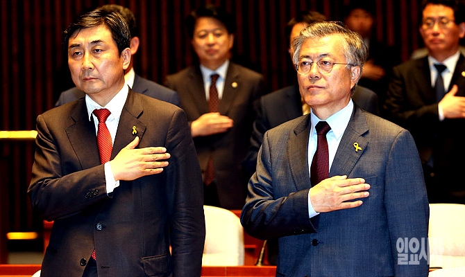 12일 서울 여의도 국회에서 열린 의원총회에서 새정치민주연합 문재인 대표와 이종걸 원내대표가 국기에 대한 경례를 하고 있다.
