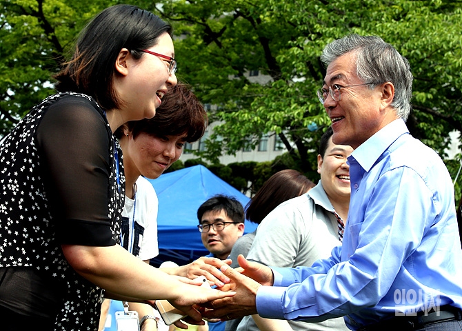 14일, 서울 여의도 국회운동장에서 '새정치민주연합 보좌진 한마음체육대회'가 열린 가운데, 한 보좌관이 자리에 참석한 문재인 대표를 반갑게 맞이하고 있다.