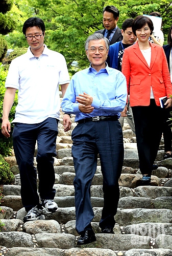 14일, 서울 여의도 국회운동장에서 열린 '새정치민주연합 보좌진 한마음체육대회'를 찾은 문재인 대표가 체육대회 현장으로 향하고 있다.