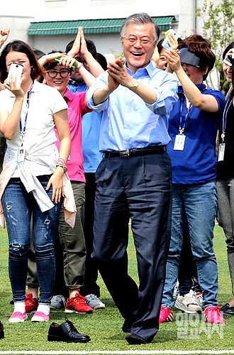 14일, 서울 여의도 국회운동장서 열린 '새정치민주연합 보좌진 한마음체육대회'에 참석한 문재인 대표가 신발던지기 게임 직후 과녁에 넣자 환호하고 있다.