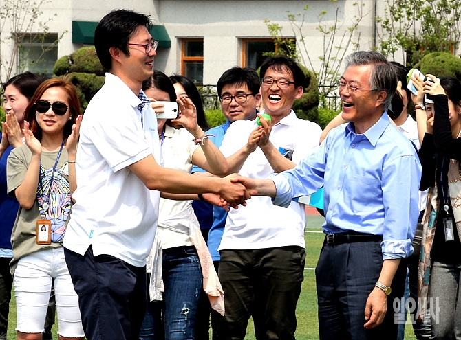 14일, 서울 여의도 국회운동장서 열린 '새정치민주연합 보좌진 한마음체육대회' 도중 문재인 대표가 신발던지기 게임 직후 정확히 신발을 과녁에 넣자 이를 지켜보던 보좌진들이 환호하고 있다.