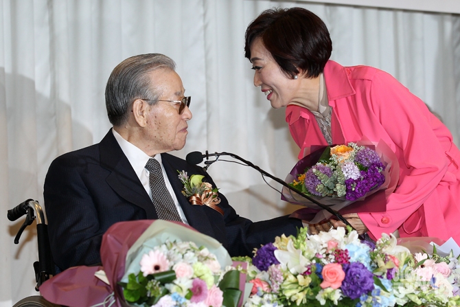 김종필 전 국무총리가 14일 오후 서울 세종문화회관 세종홀에서 열린 '운정 김종필-한국 현대사의 증인 JP 화보집' 출판기념회에서 가수 하춘화로부터 꽃다발을 받고 있다.