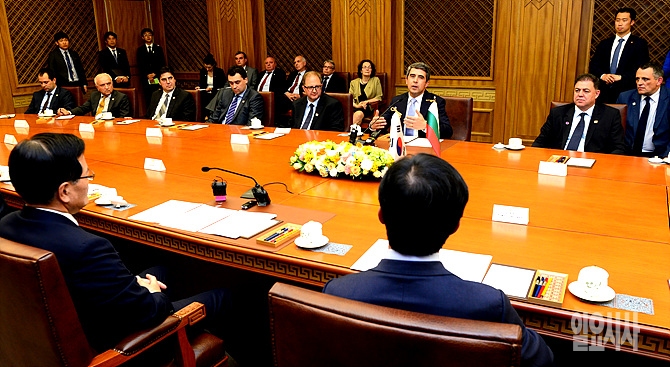 15일, 서울 여의도 국회를 예방한 로젠 플레브넬리에프 불가리아 대통령이 정의화 국회의장과 환담을 나누고 있다.