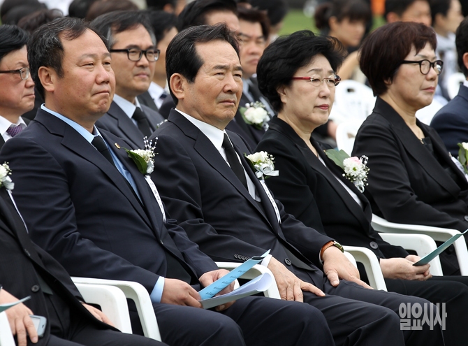 새정치민주연합 정세균 상임고문, 한명숙 전 총리를 비롯한 의원들이 18일 오전 서울 중구 태평로 서울광장에서 열린 '5·18 민주화운동 제35주년 기념 서울행사'에 참석하고 있다.