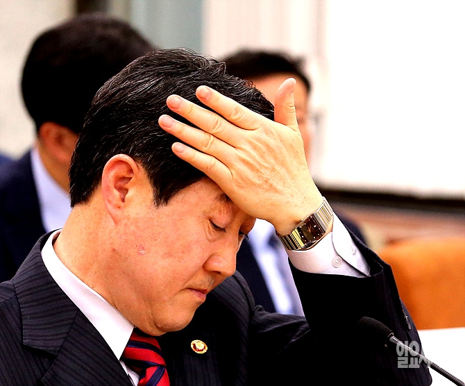 18일, 서울 여의도 국회 농림축산식품해양수산위원회 회의실서 열린 전체회의 도중 유기준 해양수산부장관이 피곤한 듯 이마를 쓸어올리고 있다.