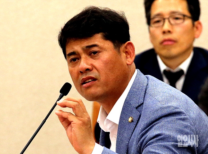 18일, 서울 여의도 국회 농림축산식품해양수산위원회 회의실서 열린 전체회의 도중 새정치민주연합 박민수 의원이 유기준 해양수산부장관에게 질의하고 있다.