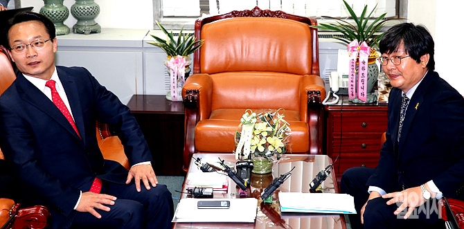 18일, 서울 여의도 국회 새누리당 원내수석부대표실에서 조해진(왼쪽)·이춘석 여야 원내수석부대표가 회동하고 있다.
