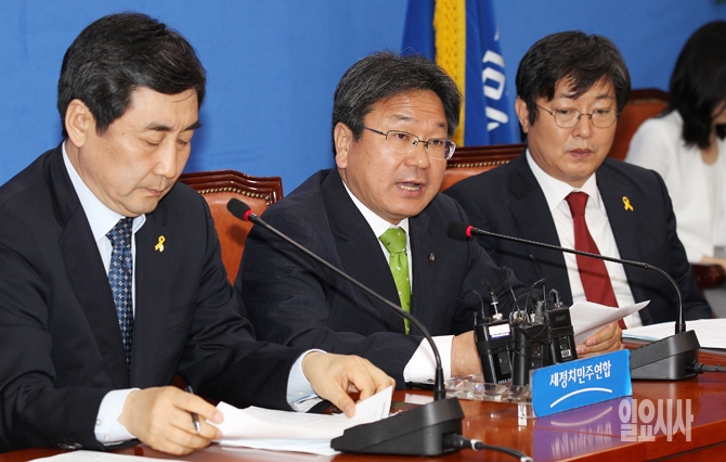 새정치민주연합 강기정 정책위의장이 19일 오전 서울 여의도 국회에서 열린 원내대책회의에서 발언하고 있다.