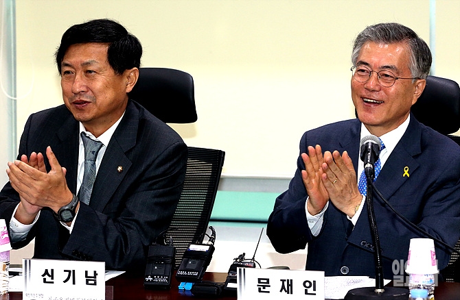 19일, 서울 여의도 국회 의원회관서 열린 '전국분권단체 연석회의 도중 새정치민주연합 문재인 대표, 신기남 참좋은정부지방위원장이 박수를 치고 있다.
