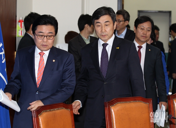 새정치민주연합 전병헌 최고위원(왼쪽부터), 이종걸 원내대표, 오영식 최고위원이  20일 오전 서울 여의도 국회에서 열린 최고위원회의에 참석하고 있다.
