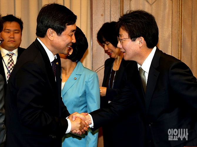 20일, 서울 여의도 국회에서 반기문 유엔 사무총장 회동 직전, 먼저 도착한 새누리당 유승민-새정치민주연합 이종걸 원내대표가 악수를 나누고 있다. (사진공동취재단)