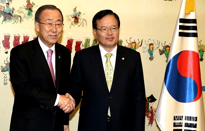 20일, 서울 여의도 국회에서 반기문 유엔 사무총장과 정의화 국회의장이 악수를 나누고 있다. (사진공동취재단)
