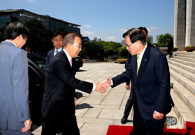 20일, 서울 여의도 국회를 예방한 반기문 유엔 사무총장과 정의화 국회의장이 본청 계단 앞에서 악수를 나누고 있다. (사진공동취재단)