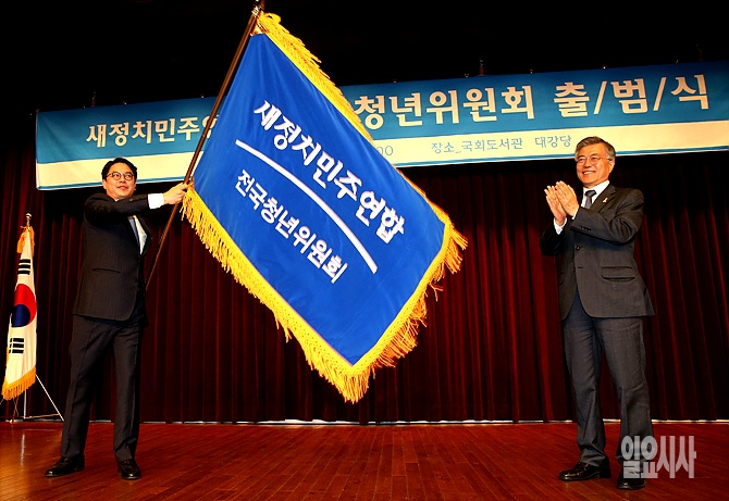 20일, 서울 여의도 국회서 열린 새정치민주연합 전국청년위원회 출범식에서 정호준 청년위원장이 문재인 대표에게서 받은 출범기를 휘날리고 있다.