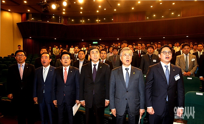20일, 서울 여의도 국회서 열린 새정치민주연합 전국청년위원회 출범식에서 문재인 대표-이종걸 원내대표 등이 애국가를 제창하고 있다.