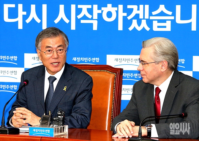 20일, 서울 여의도 국회 새정치민주연합 대표실에서 문재인 대표(사진 왼쪽)와 알렉산드르 티모닌 주한러시아 대사와 이야기를 나누고 있다.