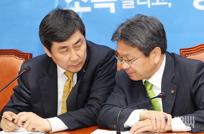 새정치민주연합 이종걸 원내대표(왼쪽)와 강기정 정책위의장이 21일 오전 서울 여의도 국회에서 열린 정책조정회의에서 논의하고 있다.
