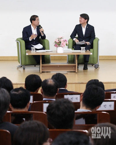 박원순 서울시장(왼쪽)과 새정치민주연합 안철수 전 공동대표가 21일 오전 서울 여의도 국회의원회관에서 열린 '공정시장을 위한 남북경제협력 좌담회'를 열고 토론하고 있다.
