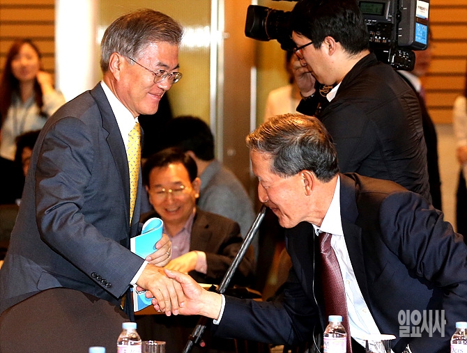 21일, 서울 여의도 전경련회관에서 열린 게르하르트 슈뢰더 독일 전 총리와의 특별 대담 직전 새정치민주연합 문재인대표가 허창수 전경련 회장과 악수를 나누고 있다.