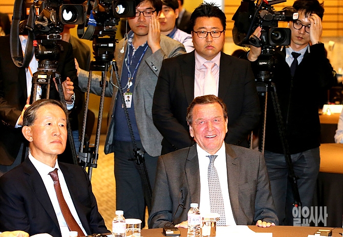 21일, 서울 여의도 전경련회관에서 열린 게르하르트 슈뢰더 독일 전 총리와의 특별 대담 직전, 슈뢰더 총리가 잠시 웃음 짓고 있다.
