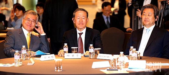 21일, 서울 여의도 전경련회관에서 열린 게르하르트 슈뢰더 전 독일총리 강연 도중, 김무성-문재인 여야 대표가 기분 좋은 듯 웃음 짓고 있다.
