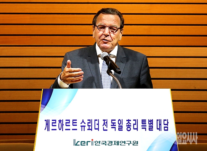 21일, 서울 여의도 전경련회관서 열린 게르하르트 전 독일총리 특별대담에서 슈뢰더 전 총리가 강연하고 있다.