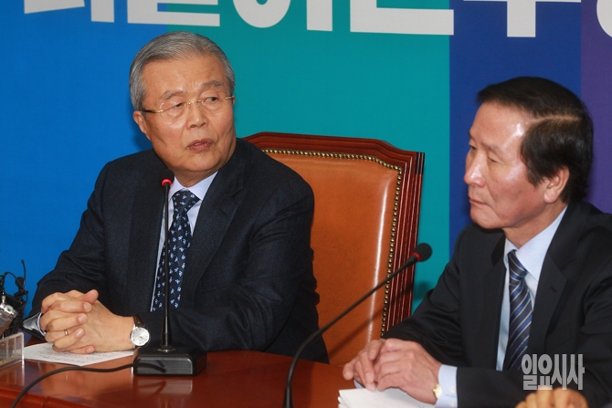 김종인 더불어민주당 비대위원장이 12일 오전 서울 여의도 국회에서 열린 더불어민주당 개성공단기업협회 간담회에서 정기섭 개성공단기업협회장 등 개성공단기업협회 관계자들을 보며 모두발언을 하고 있다.