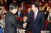 국민의힘 유상범 의원과 유상임 신임 과학기술정보통신부장관이 28일 오후 서울 여의도 국회에서 열린 제417회국회(임시회) 2차 본회의에서 만나 악수하고 있다. 유 의원과 유 과기부 장관은 배우 유오성과 함께 형제인 것으로 알려져 있다. 일요시사=고성준 기자(joonko1@ilyosisa.co.kr) <joonko1@ilyosisa.co.kr>