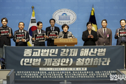 국민의힘 조배숙 의원과 대한민국광역기독교총연합회 회원들이 28일 서울 여의도 국회 소통관에서 열린 '종교법인 강제 해산법(민법 개정안) 철회 촉구 기자회견'을 하고 있다. 이날 조 의원 등 참석자들은 "일제 강점기의 포교규칙을 연상하게 하는 '종교법인 강제 해산법' 발의를 강력히 규탄한다"고 밝혔다. 일요시사=고성준 기자(joonko1@ilyosisa.co.kr) <joonko1@ilyosisa.co.kr>