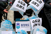 내년 1월1일부터 종량제 쓰레기봉투를 그대로 매립하지 않고 재활용품 선별 후 남은 잔재물만 소각해 매립하는 ‘생활폐기물 직매립 금지’ 제도가 시행된다. 하지만 서울시 등 수도권의 신규 소각장 설치가 지연되면서, 쓰레기 처리 부담이 고스란히 비수도권으로 전가될 우려가 커지고 있다. 사진은 지난 15일, 서울 중구 서울시청 앞에서 환경단체 회원들이 수도권 쓰레기가 비수도권으로 떠넘겨지는 상황을 비판하는 퍼포먼스 장면. 글·사진=천재율 기자 1000jae@ilyosisa.co.kr