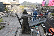 서울시 관계자들이 14일 오전 서울 종로구 광화문광장에서 이순신 동상 세척 작업을 하고 있다. 동상 세척은 서울시가 매년 보존 및 관리를 위해 전문 인력을 동원해 실시하는 정기 작업의 일환이다. 황사와 미세먼지 등 동상에 두껍게 덮인 묵은 때는 물청소와 이물질 제거 작업 등 세척 공정으로 제거한다. 일요시사=천재율 기자(1000jae@ilyosisa.co.kr) <1000jae@ilyosisa.co.kr>