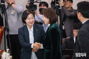 추미애 위원장(왼쪽)과 국민의힘 나경원 의원이 7일 오후 서울 여의도 국회에서 열린 법제사법위원회 전체회의에 앞서 웃으며 새해 인사를 나누고 있다. 일요시사=천재율 기자(1000jae@ilyosisa.co.kr) <1000jae@ilyosisa.co.kr>