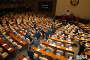 국민의힘 최수진 의원이 23일 오후 서울 여의도 국회에서 열린 제430회 국회(임시회) 제2차 본회의에서 ‘정보통신망 이용촉진 및 정보보호 등에 관한 법률 일부개정법(허위조작 정보근절법)’에 대한 필리버스터(무제한 토론)을 시작하자 더불어민주당 의원들이 본회의장을 나가고 있다. 허위조작 정보근절법은 불법·허위·조작 정보의 판단 요건 등을 구체화하고, 정보통신망 내에서 이들 정보의 유통을 금지하는 내용을 골자로 하고 있다. 일요시사=천재율 기자(1000jae@ilyosisa.co.kr) <1000jae@ilyosisa.co.kr>