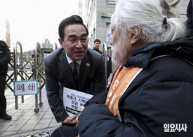 [포토] 출근길 '전장연' 만난 박홍근 기획예산처 장관 후보자