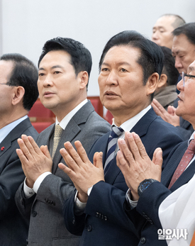 [포토] 법회 참석해 합장하는 정청래-장동혁