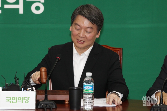 2일 오전 서울 여의도 국회에서 열린 국민의당 최고위원회의에서 안철수 국민의당 공동대표가 의사봉을 두드리고 있다.